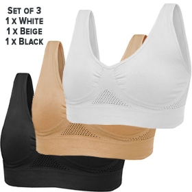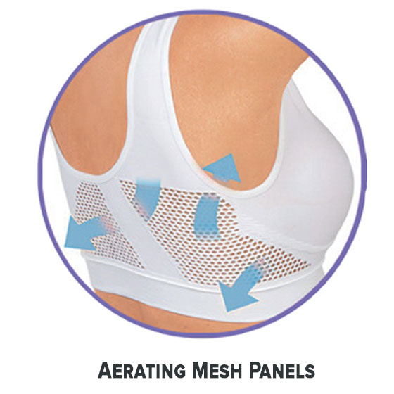 This Air-Flo designed bra has aerating mesh panels with 360° air flow cooling technology. Moisture evaporates leaving you dry, cool, & fresh while offering maximum comfort. Soft wide nonchafing under band for superior support.