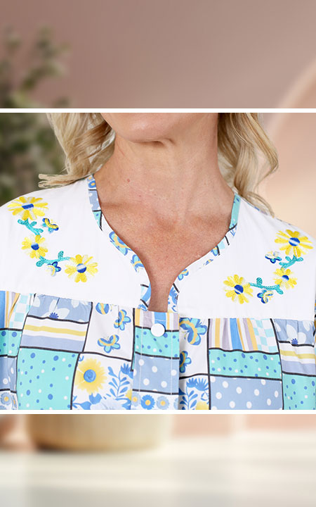 Easy to wear, full button front duster. Beautifully printed and embroidered with patch pockets and short sleeves. Printed woven polyester/cotton. Machine wash.
