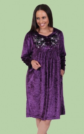 Soft and warm pannemvelour will be just whatmyou need this winter.mFront yoke is detailed withmbeautiful floral embroidery and has a 3 buttonmclosure. Long sleeves and on seam pockets.m100% Polyester. Machine wash.