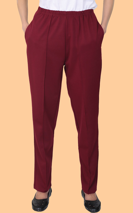 With Elastic waist, stitched-down front crease, gently tapered leg and side seam pockets. Polyester knit. Machine wash & dry.