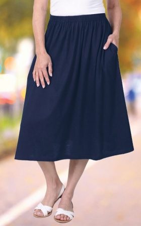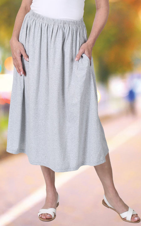 Throw on and go! The perfect every day skirt for running errands, shopping, lunches and more. Full elastic waist with side seam pockets. Soft, comfortable knit cotton/polyester. Machine wash delicate.