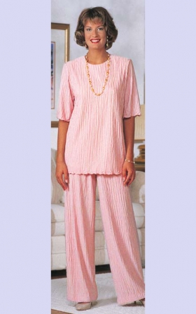 Comfort and good looks are yours when you step out for all those special occasions on your social calendar. Tunic length top with easy-to-access jewel neckline, back keyhole opening, padded shoulders, elbow length sleeves and lettuce edged hemline. Straight, wide legged pants have comfort fit elastic waist. Washable polyester ripples knit.