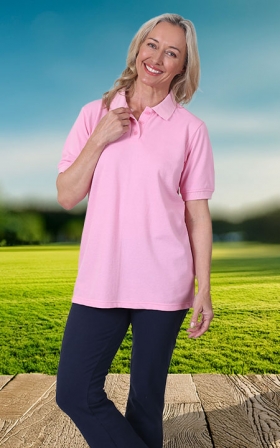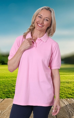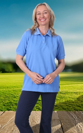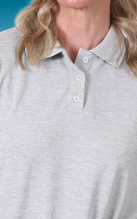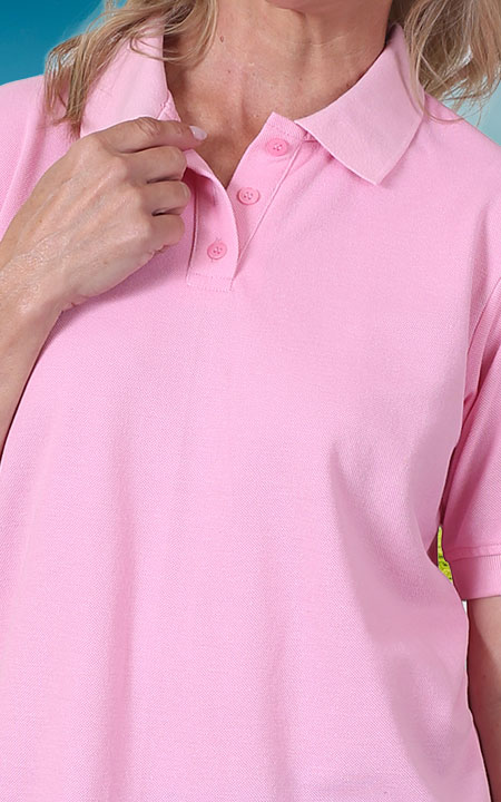 The perfect top for summer days. Partial button front, polo collar and side split hem. Soft piqué knit cotton/polyester. Machine wash delicate.