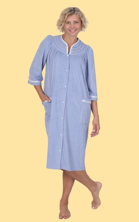 Whether you are starting the day or winding it down, you will love the easy comfort of our Terry Robe. With full-snap front, patch pockets, gathering at the front and back for a generous ft, three quarter sleeves and a trapunto yoke with delicately stitched details. Made of breathable cotton / polyester terry fabric. Machine wash and dry.