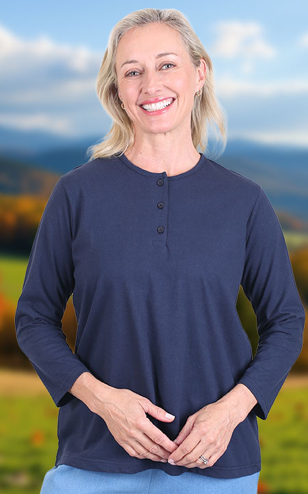 A great layering piece. Featuring partial button front and ¾ length sleeves. In a lighter weight cotton/poly knit. Perfect for under jumpers and jackets. Machine wash. Approx length S – 5X; 66cm – 74cm (26”-29”).